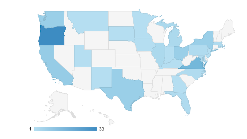 Oregon is the leader, and should be every day, followed by Virginia which doesn’t count because it’s a bot, then California and New York.