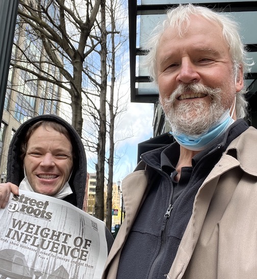 I was downtown Portland near Powells talking to a street guy giving away Street Roots.