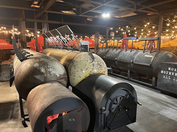 These are the railroad tanker looking smokers with the light canopy over picnic tables in the background for outdoor dining.