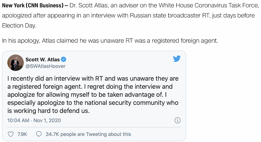 Let’s agree that we will not be taken advantage of like Dr. Scott Atlas was with his professed ignorance of who is and who isn’t a registered foreign agent. Shouldn’t a guy working in the White House know this stuff?