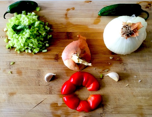 Add everything together in a big pot with two cans of diced tomatoes with juice, one can of V8 juice, a cup and a half of vegetable broth, a dash of Worcestershire sauce, vinegar, splash of wine, and salt and pepper to taste.