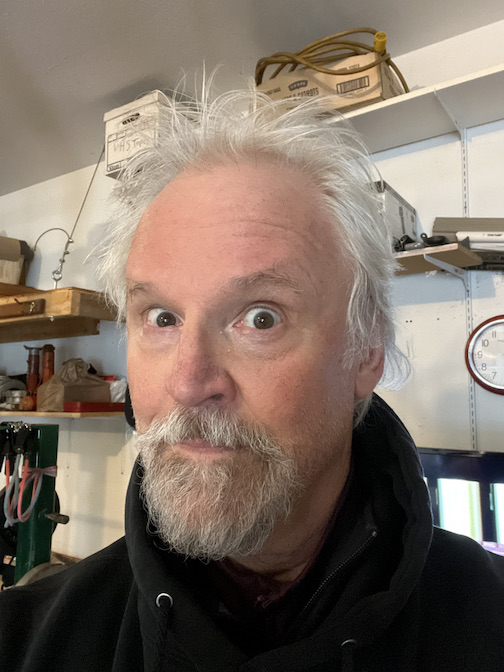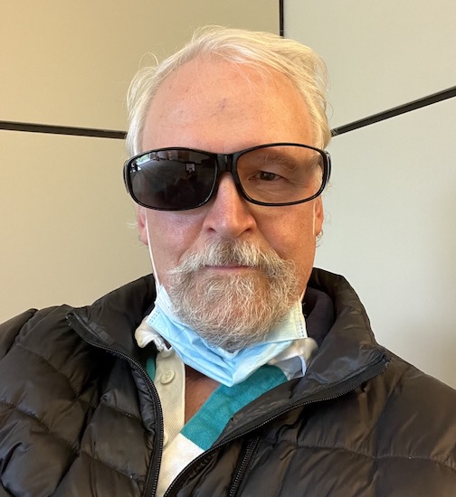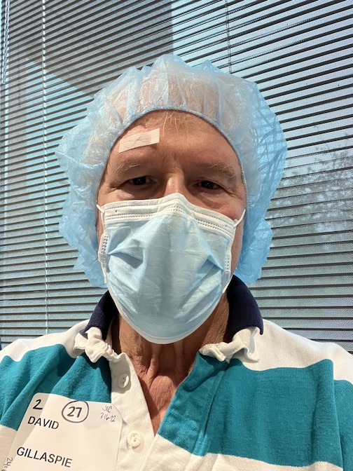That’s me in this section’s pic joining the ranks of all the other old guys. We got examined, scheduled, and wore the uniform, which consists of a marker for the eye work and a custom snood.