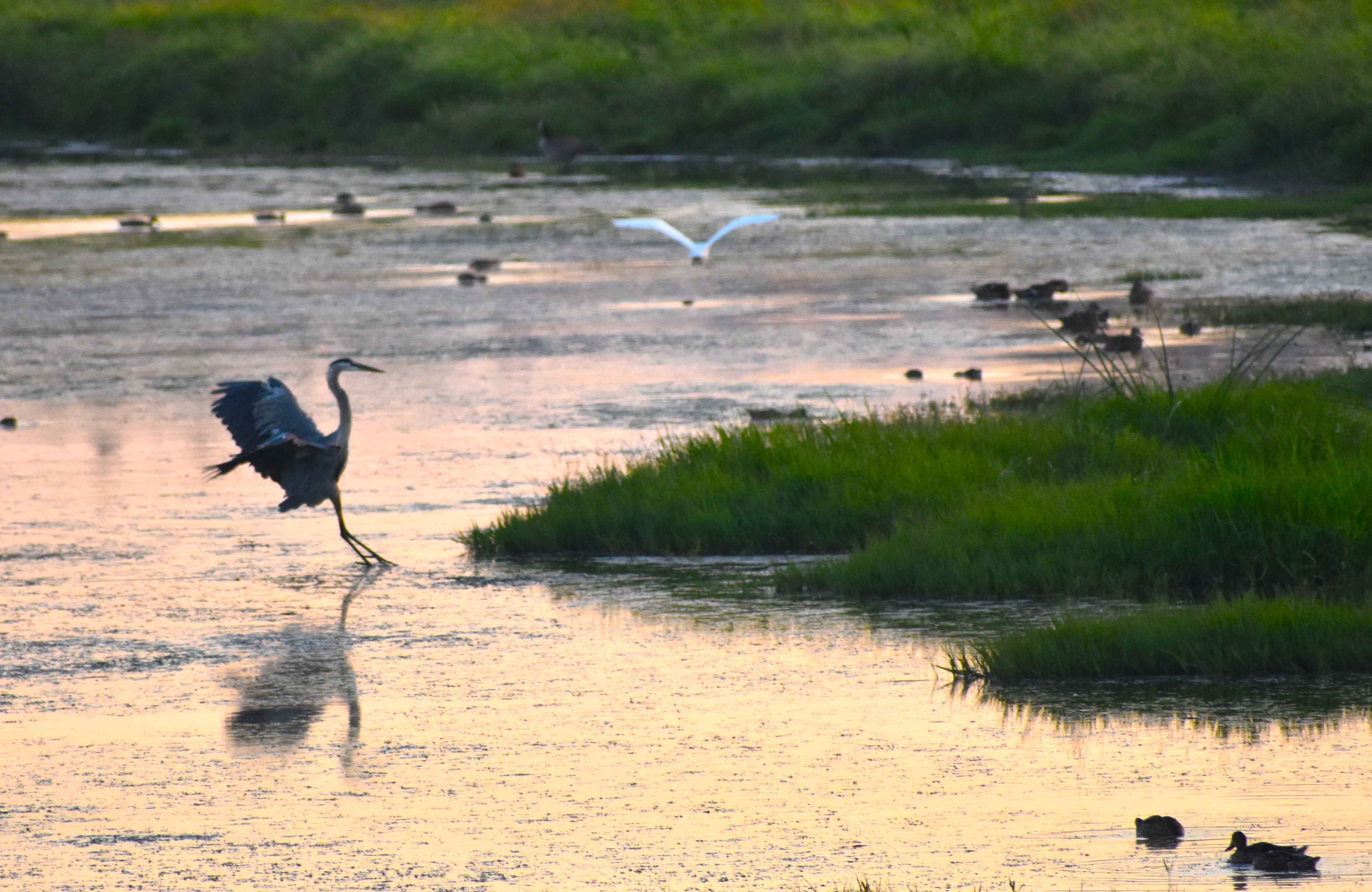 Blue heron landing, white egret launching, and a variety of ducks watching the big bird show.