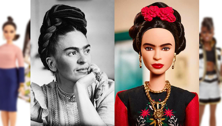 The Kahlo doll features the familiar floral crown, braided black hair, flowing print dress, fringe shawl and de rigueur earrings and necklace. Lacking, however, are Kahlo’s signature uni-brow, her much commented-upon upper lip hair and the baubles that adorned most of her fingers. Mattel also made her look slimmer.
