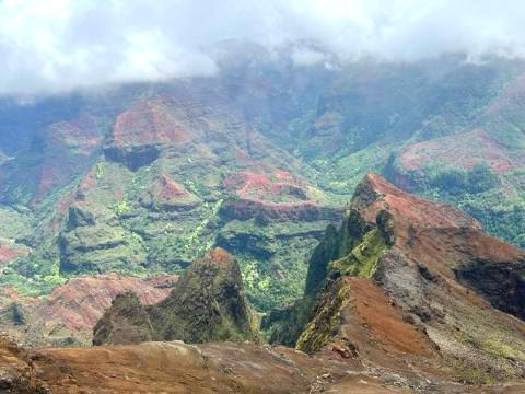 One part volcanic, one part erosion, and pretty parts in enough hues of green for a year long St. Patrick’s Day, Kauai’s Grand Canyon is a mile across and 3600 feet deep based on signs at pull-outs.