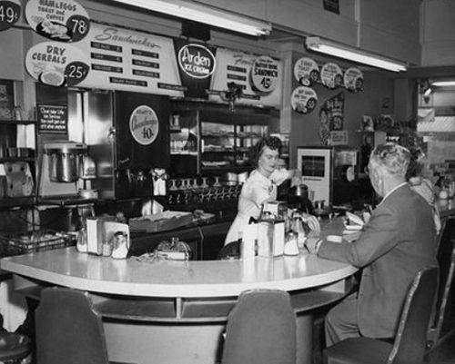 The top image shows the curved lunch counter from the old Portland Newberry’s on 5th and Alder.