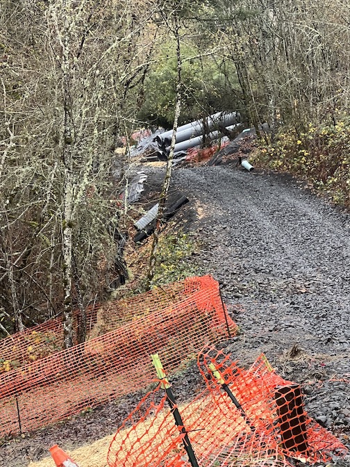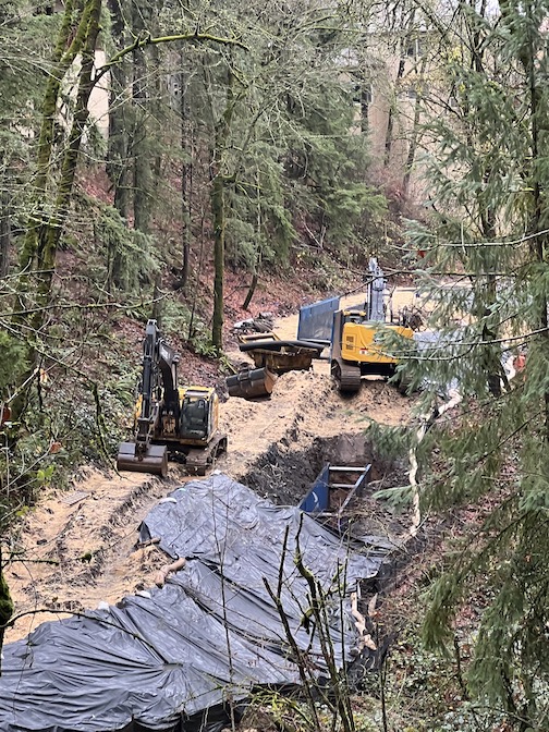 We navigated the switchbacks on the northern trail, stepping carefully over mud-slick bare patches and exposed tree roots, aiming for the machinery down below.