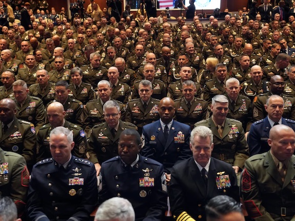 They were following orders to report in, to show up for a televised talk from the secretary of defense and the big guy from a stage in front of them.