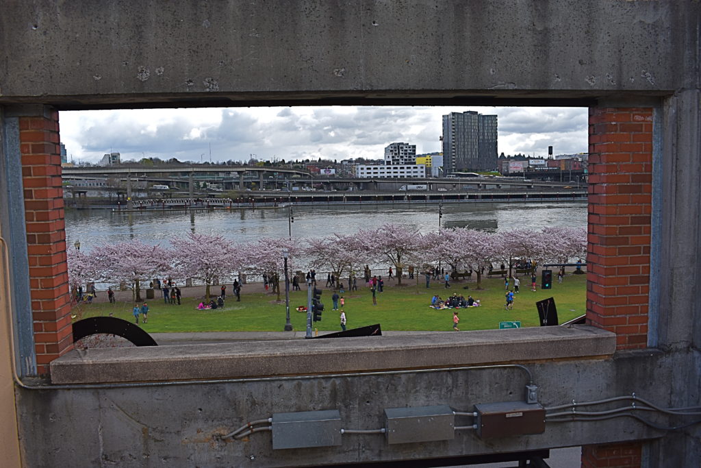 The Willamette River running high, Convention Center horns out, flowers sucking up the sun.