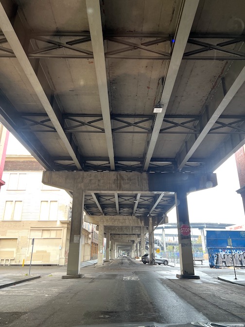 Under the Hawthorne Bridge ramp looking like the French Connection car chase