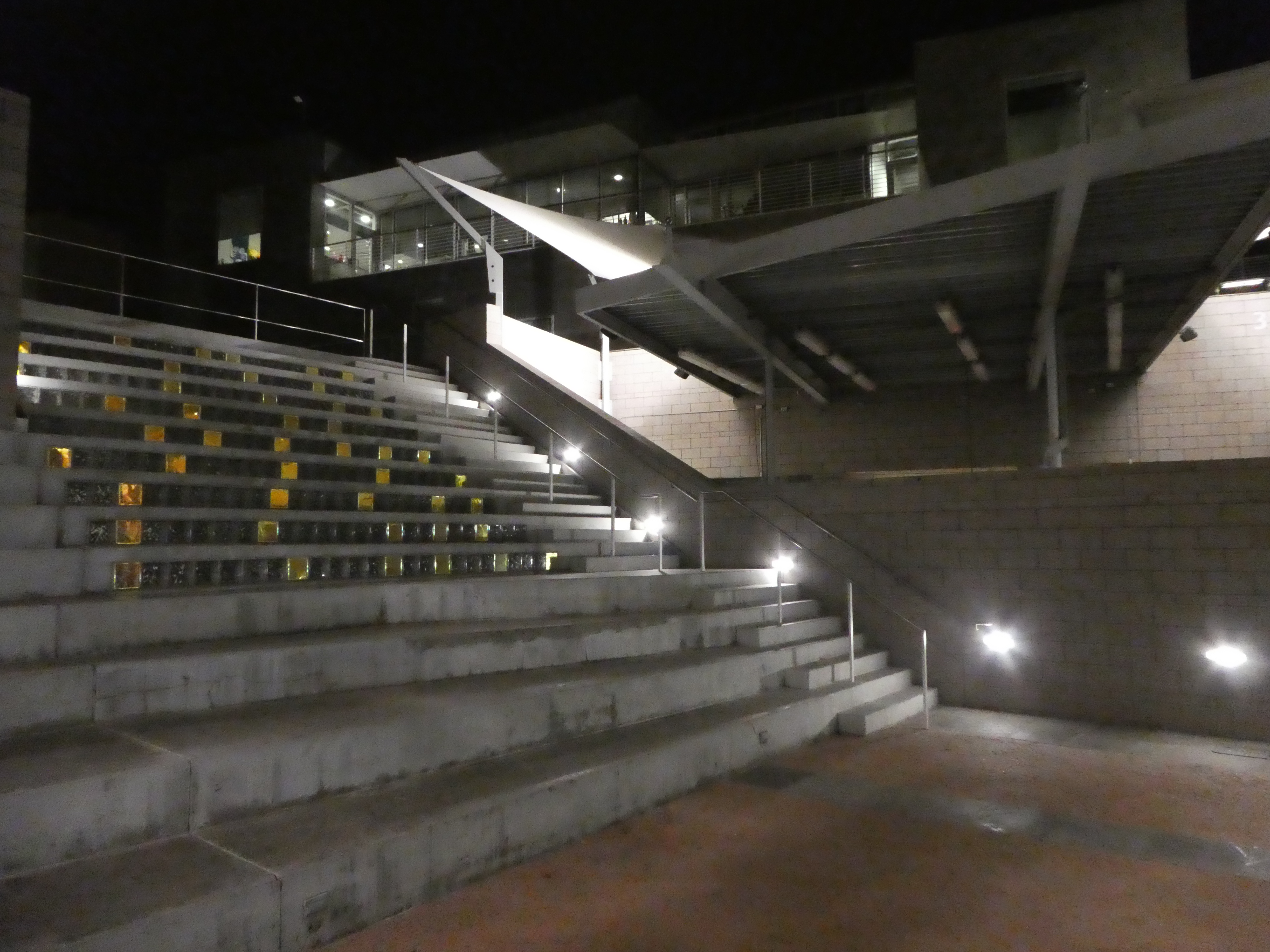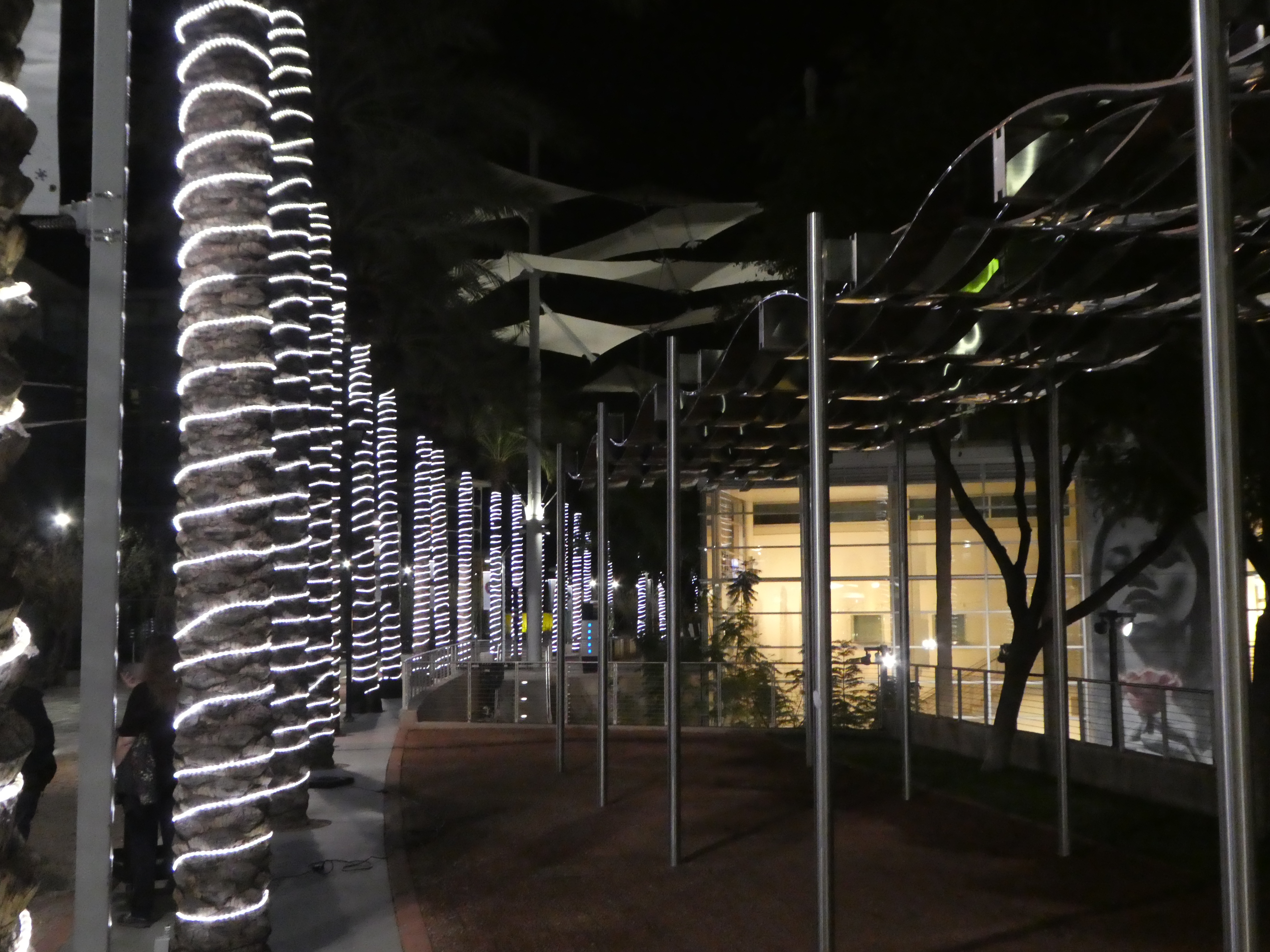 Walk down the block to the Arts Center after dinner. Mesa Arizona Arts Center feels unreal at night with the light design and architecture.