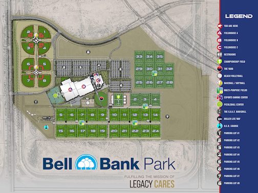 Bell Bank Park, powered by Legacy Sports USA is a 320 acre World Class family sports and entertainment park. The one-of-a-kind park features a 3,000 seat outdoor stadium, eSports arena, indoor arena, (35) soccer/lacrosse/football fields, (57) indoor volleyball courts, (8) baseball & Adult Softball fields and (16) fastpitch softball and little league baseball fields, (19) basketball courts, (41) pickleball courts, (12) beach volleyball courts, Obstacle Course Racing Park, (22) indoor soccer courts, Gymnastics Center, Dance Studio, Cheer Center, Sports Performance Center, Family Fitness Center, Wellness Center, Kids Play Center, 2.7 acre Great Lawn for concerts and events, 17,000sqft Sports Restaurant and Bar and so much more.