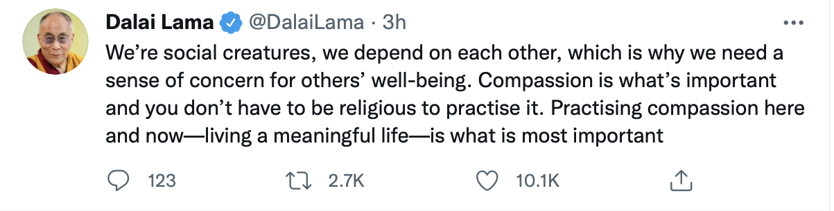 Twitter is one of the Dalai Lama’s platforms. He says practice compassion. Ten thousand people agree. Almost three thousand people spread his words to their people. In three hours.