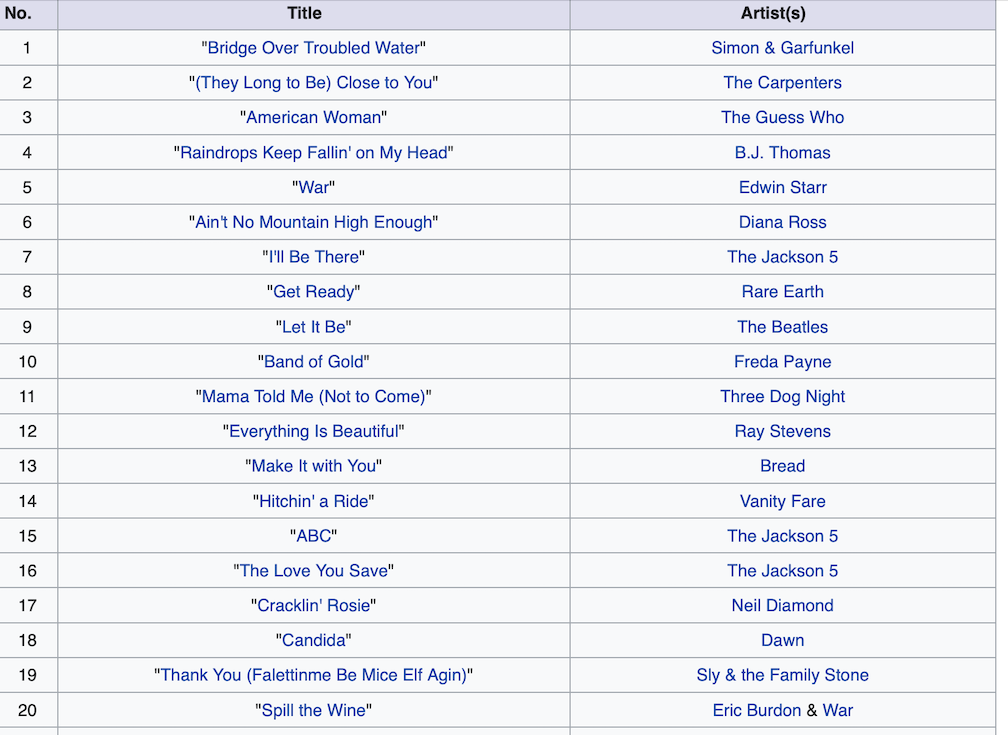 Whatever the case at the time, regret songs topped the hits list in 1970: