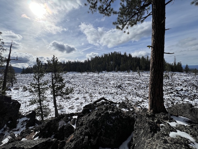 We came out of the tree line to find a huge lava flow with dark stone peaking out of the snow.