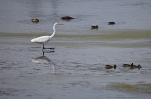 A Portland bird is a patient bird. As you can see it gets along well with others. Instead of using their orange beak to peck everything in sight, like the ducks, it stalks its own prey.