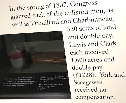 The beautiful Lewis and Clark Interpretive Center covers the topic thoroughly. They could have left out the part about York and Sacagawea compensation compared to the rest of the group. Kudos to them for presenting accurate history.