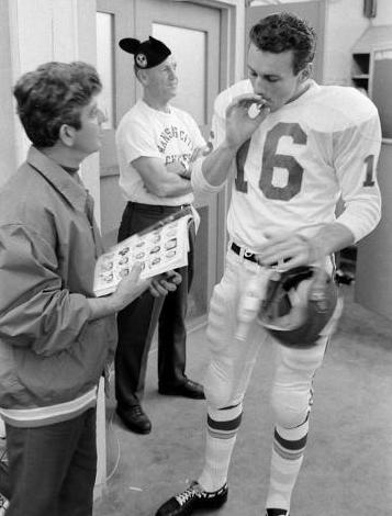That’s Len Dawson of the first Kansas City Chiefs getting warmed up at half-time.