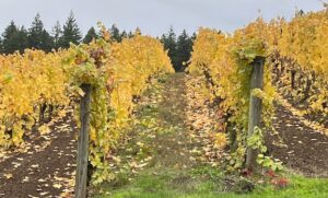 Wintering wine is what it looks like with the grapes gone to juice. Wine country in Oregon’s Willamette Valley at ground level where the fruit had been. The turning leaves paint a splash of color across the hillsides this time of year. What’s it remind you of?