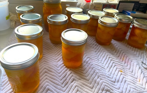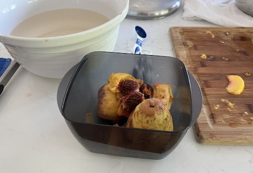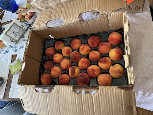 A box of peaches at the end of the season where the U-Pick is over and what’s left are growing riper by the minute.
