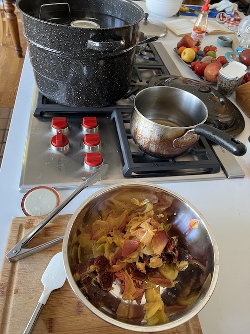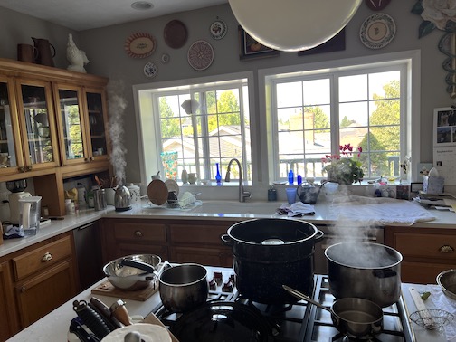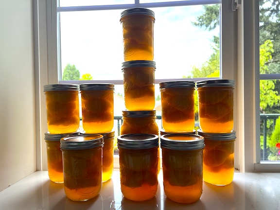 Hot pack – In a large saucepan place drained fruit in syrup, water, or juice and bring to boil. Fill jars with hot fruit and cooking liquid, leaving ½-inch headspace. Place halves in layers, cut side down.
