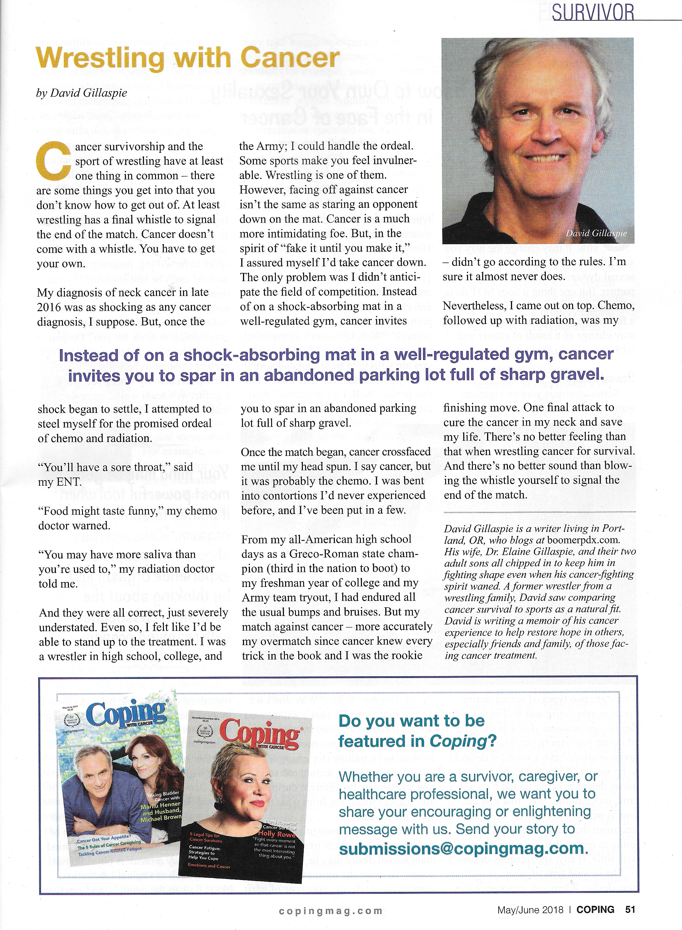 That was the text from the Coping With Cancer article ‘Wrestling With Cancer.’ This is what it looked like in the magazine: